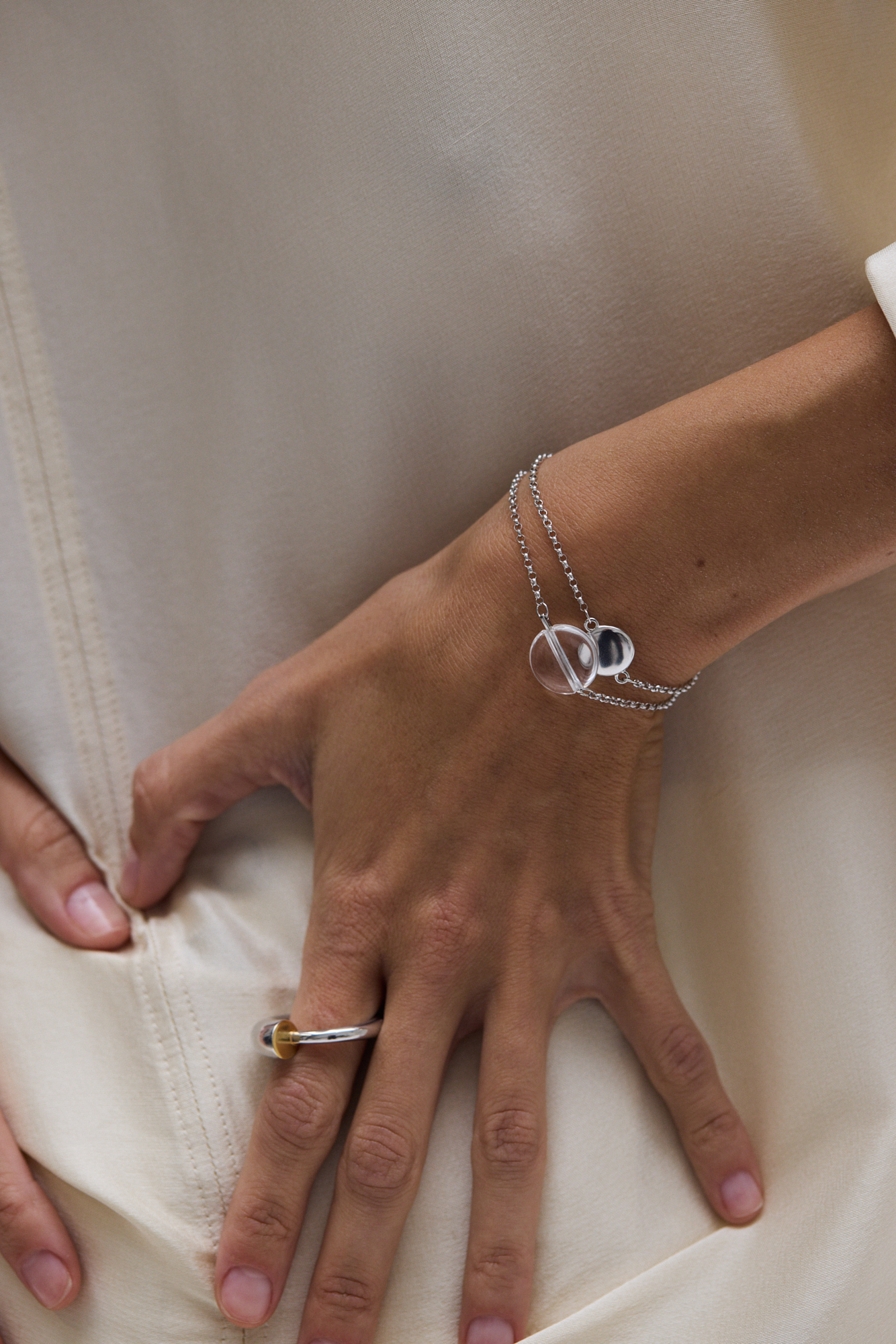 В этом браслете встречаются два диска, серебряный и хрустальный. Диски на цепочках зафиксированы так, чтобы один чуть перекрывал другой, символизируя затмение. Горный хрусталь для всех украшений отбирается и гранится вручную по нашим чертежам, а хрустальный диск отполирован снаружи и внутри.