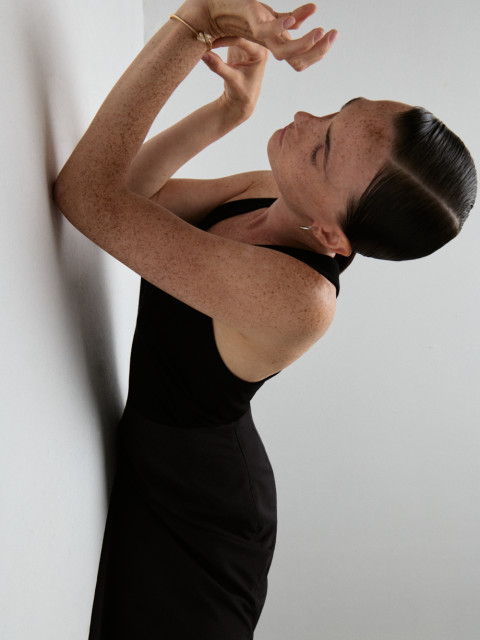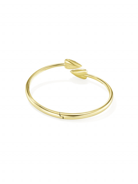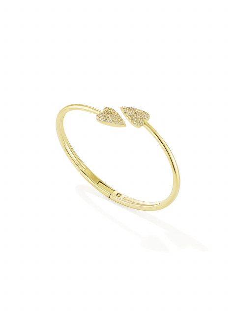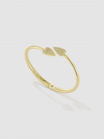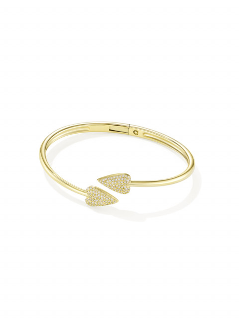 Золотой браслет с двумя сердцами вытянутой формы по мотивам украшения из фламандского иллюстрированного часослова 15 века. Чтобы надеть браслет, надо раскрыть его посередине. Благодаря пружинке он сам закроется на запястье. Сердца покрыты россыпью из 130 бриллиантов.