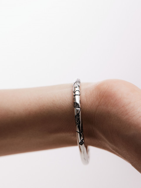 Цветной узор — не эмаль, а нанокерамика. Браслет целиком покрывают цветом, запекают в печи, затем снимают слой керамики, так чтобы цвет остался только внутри узора. Это полностью ручная работа. Небольшие участки узора могут остаться непрокрашенными, и нам это нравится. Каждый браслет уникален и может отличаться от фотографии на сайте.