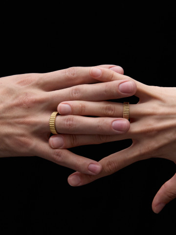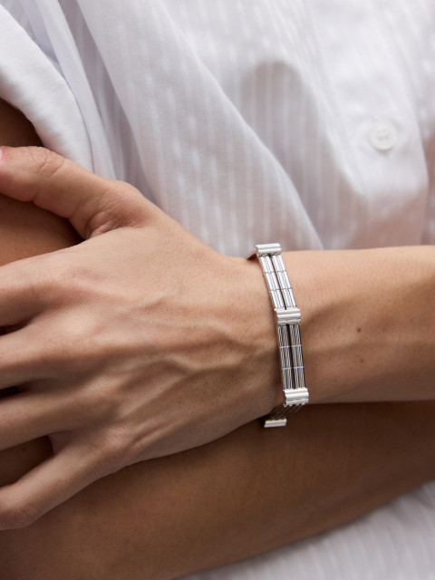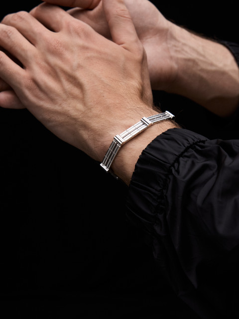 Детали соединяются штифтами по принципу часового браслета, поэтому такой браслет никогда не перекручивается. У него приятный вес и незаметный замок с кнопками, вдохновленный замками на часах.