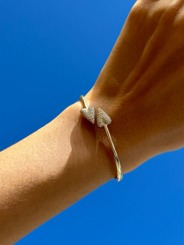 Золотой браслет с двумя сердцами вытянутой формы по мотивам украшения из фламандского иллюстрированного часослова 15 века. Чтобы надеть браслет, надо раскрыть его посередине. Благодаря пружинке он сам закроется на запястье. Сердца покрыты россыпью из 130 бриллиантов.