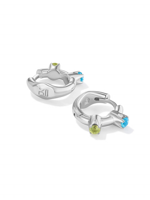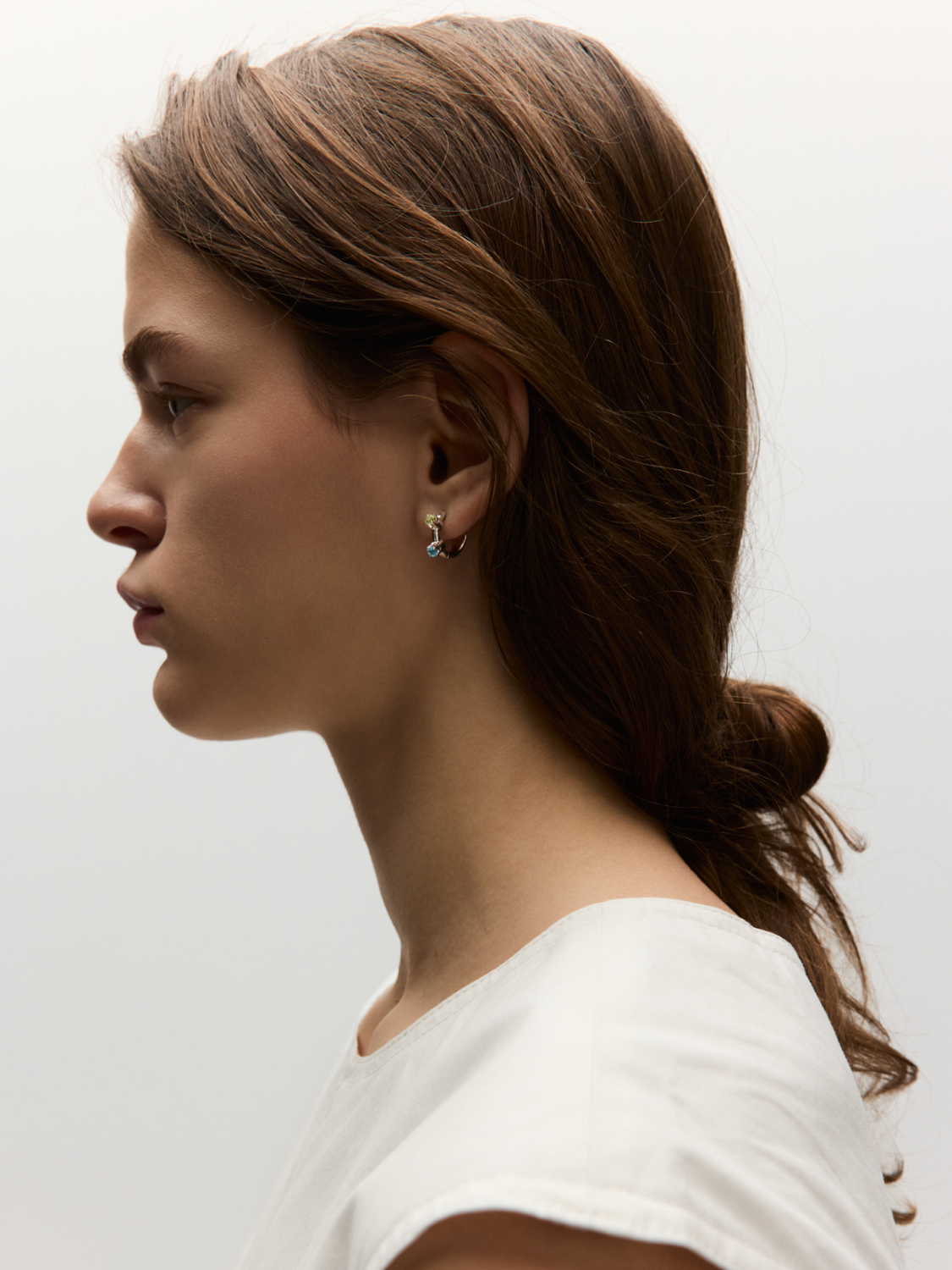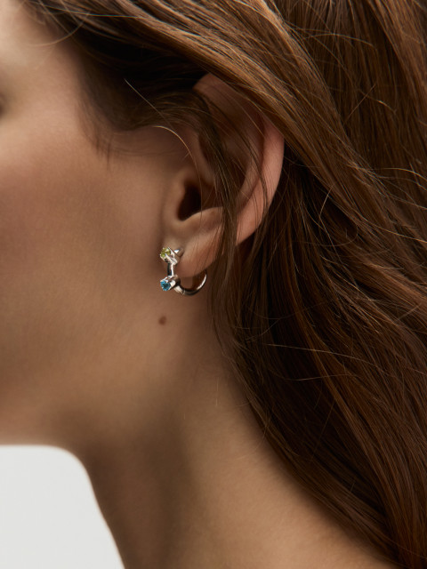 В этих обнимающих мочку серьгах голубой топаз и нежно-зелёный перидот (хризолит) закреплены в шахматном порядке, а форма крошечных лапок-крапанов отсылает к фирменным лепесткам J.Kim.