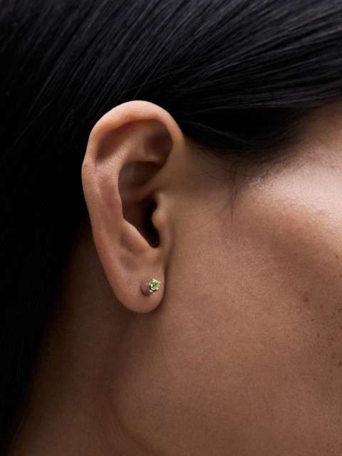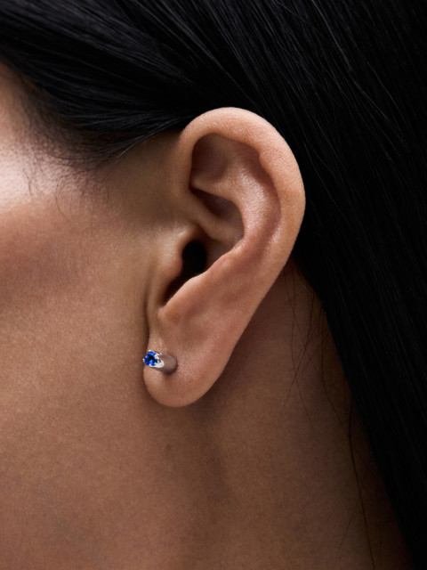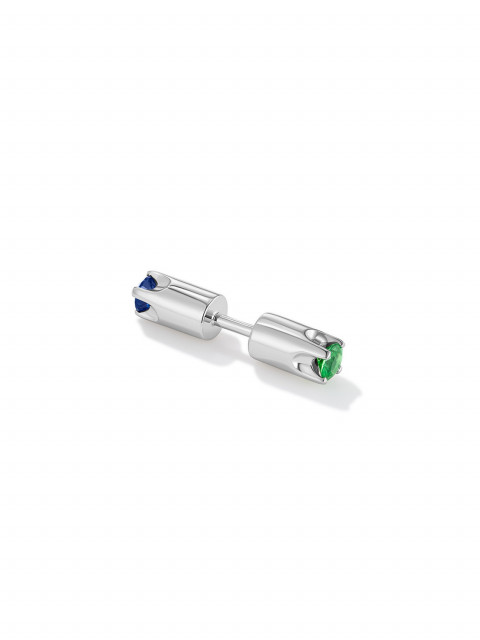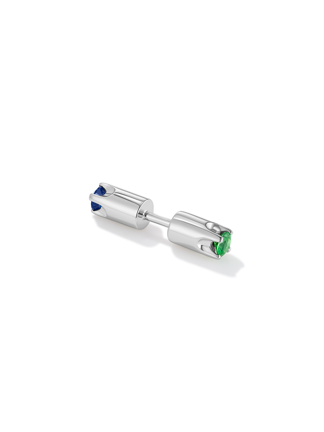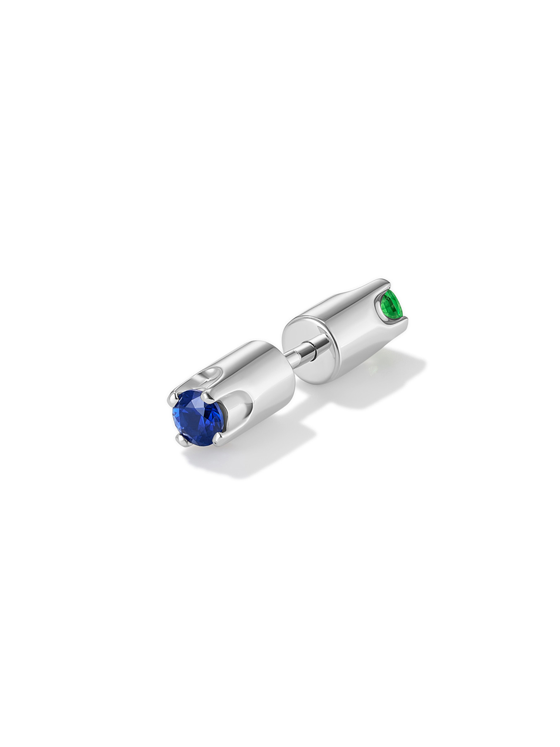 Эти серьги пополнили семейство пуссет-перевертышей в Августе. Синий сапфир и зеленый цаворит закреплены на разных сторонах, так чтобы украшение можно было переворачивать, а форма крошечных лапок-крапанов отсылает к фирменным лепесткам J.Kim.