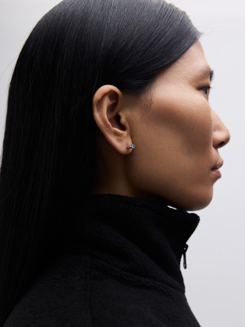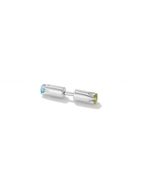 Эти серьги пополнили семейство пуссет-перевертышей в Августе. Голубой топаз и нежно-зелёный перидот (хризолит) закреплены на разных сторонах, так чтобы украшение можно было переворачивать, а форма крошечных лапок-крапанов отсылает к фирменным лепесткам J.Kim.
