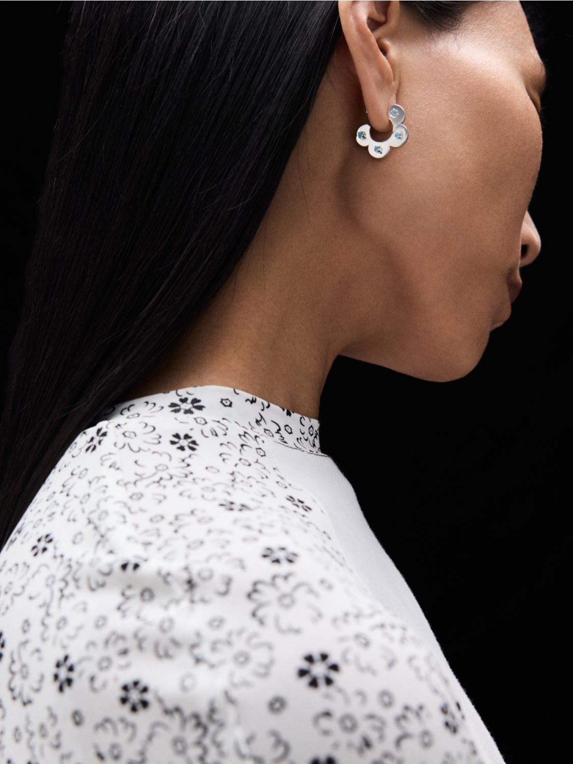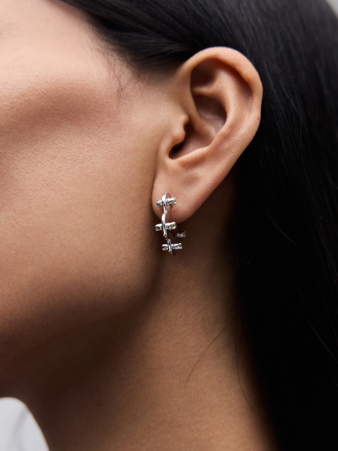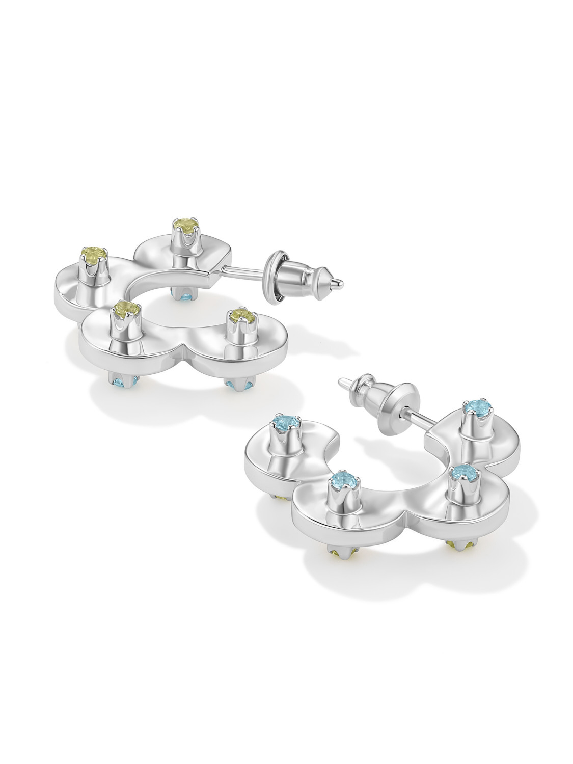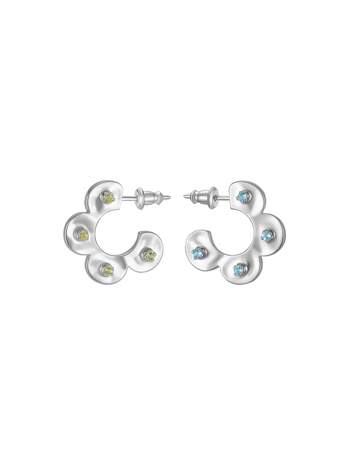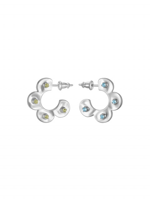 В этой паре серёг природные камни закреплены особым образом так, чтобы были выдны сразу оба цвета. С одной стороны нежно-зелёный перидот (также хорошо нам знакомый как хризолит), а с другой — голубой топаз. Поверхность серьги выполнена из слегка оплывшего металла, имитируя слегка размятое тесто. А форма крошечных лапок-крапанов отсылает к фирменным лепесткам J.Kim.