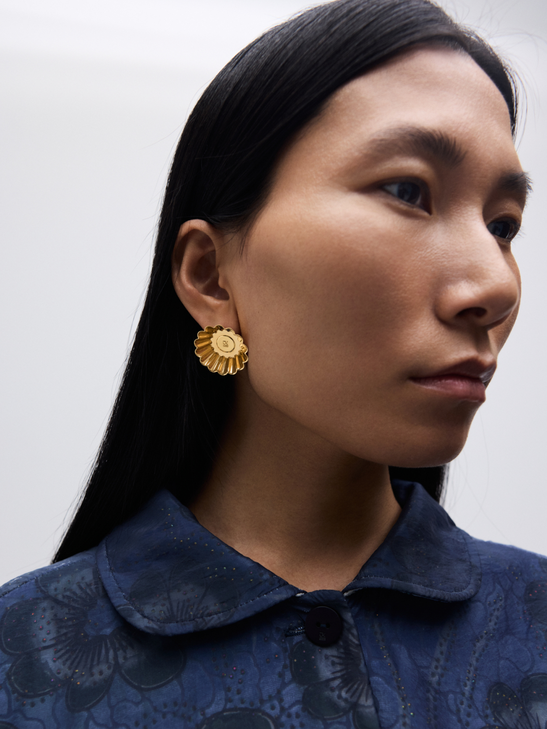 Украшение из коллаборации Avgvst x J.Kim, посвящённой гостеприимству. В центре внимания — выпечка и плоские силуэты, будто вырезанные из раскатанного скалкой теста. Заметные серьги в виде форм для кекса, знакомых ещё нашим мамам и бабушкам.