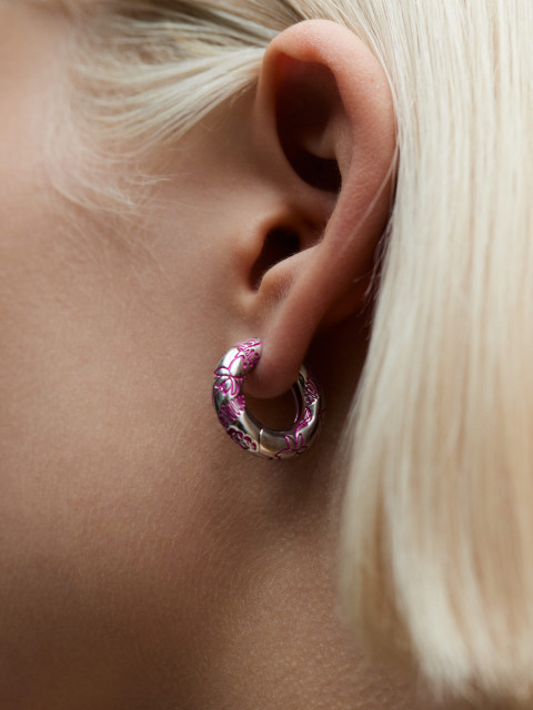 Цветной узор — не эмаль, а нанокерамика. Серьги целиком покрывают цветом, запекают в печи, затем снимают слой керамики, так чтобы цвет остался только внутри узора. Это полностью ручная работа. Небольшие участки узора могут остаться непрокрашенными, и нам это нравится. Каждая пара уникальна и может отличаться от фотографии на сайте.