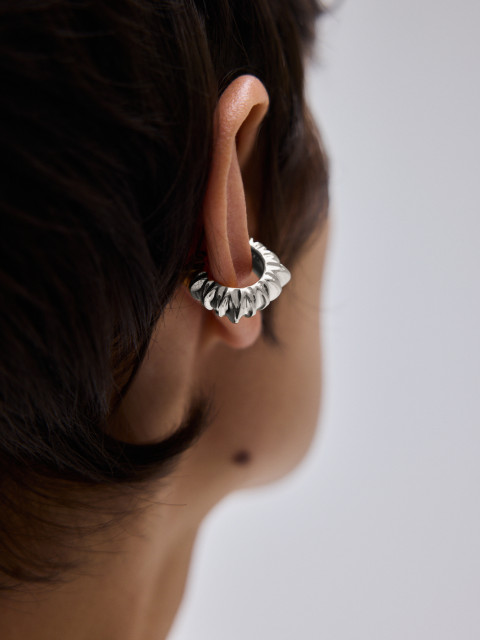 Широкий текстурный кафф необычного силуэта, придуманный во время изучения фотографий солнечной «короны» — самого горячего слоя атмосферы Солнца. Удобный, заметный, ловит и отражает блики света своими многочисленными поверхностями.