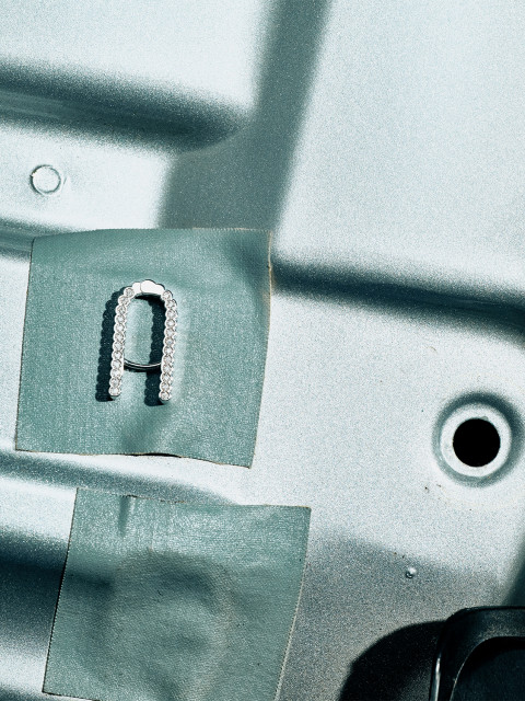 Нескучные серьги с бриллиантами на каждый день. Внутренняя сторона тоже имеет ребристый ритм стекляруса — это сделало серьги более требовательными в производстве, зато красивый дробный блик виден и снаружи и внутри. Внешняя грань выложена бриллиантами — если решите притушить сияние, серьги можно надеть бриллиантами к себе.