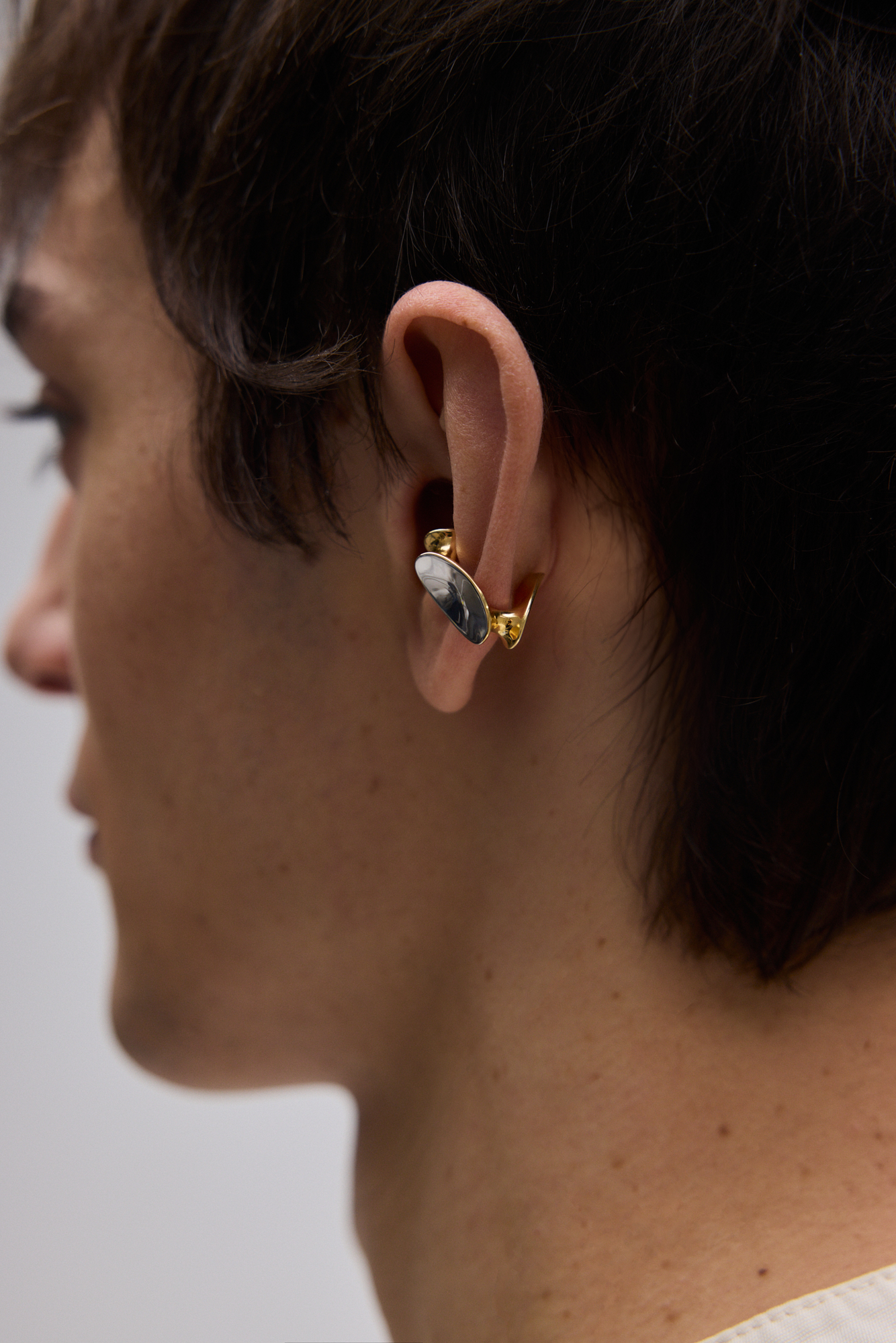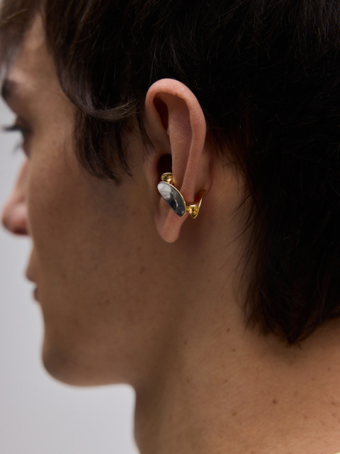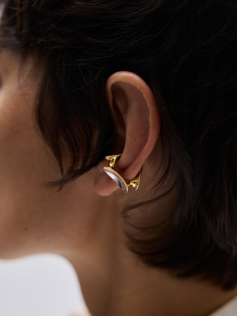 Кафф, составленный из эллипсов, которые будто притягиваются к телу. Просвет этого каффа чуть меньше, чем обычно. Если большинство каффов вам велики, то эта модель будет сидеть плотнее. Начинайте надевать кафф через самую тонкую часть уха.
