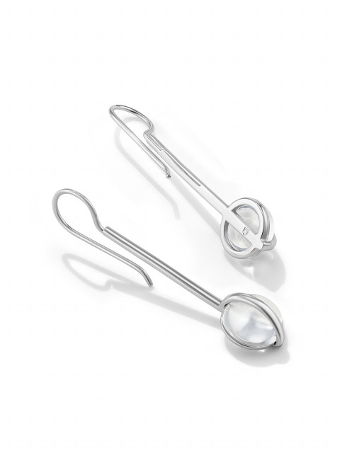 Прозрачный горный хрусталь ручной огранки закреплен особым невидимым способом, так что кажется, будто камень свободно парит, перехваченный серебряной лентой.