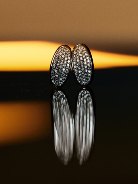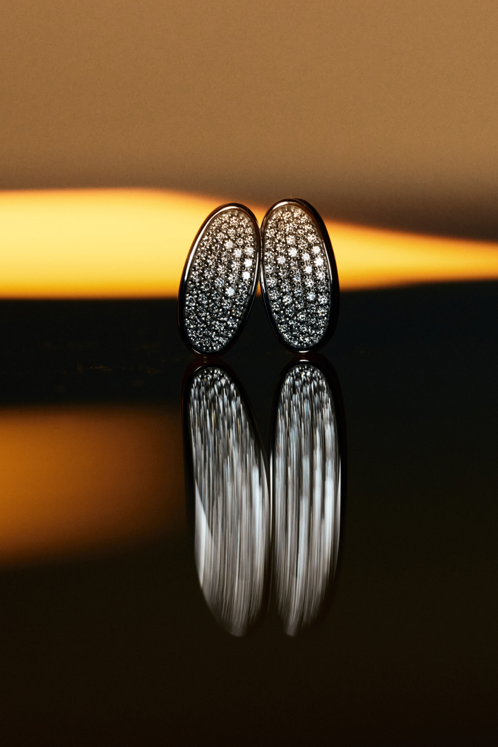 В коллекции Eclipse мы исследовали притяжение абстрактных форм: так элиипсы, которые будто притягиваются к мочке с разных сторон, образовали конструкцию серег.