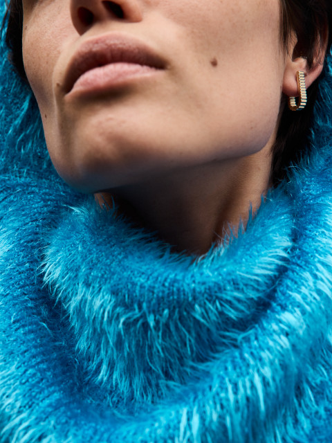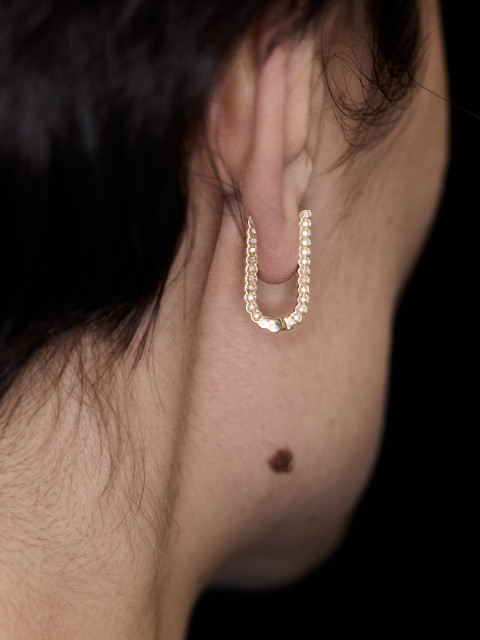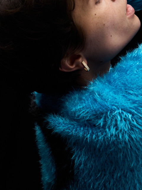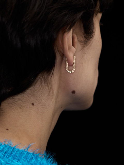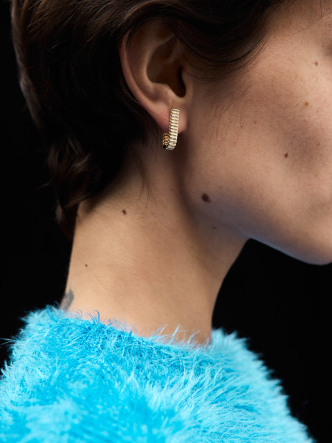 Нескучные серьги с бриллиантами на каждый день. Внутренняя сторона тоже имеет ребристый ритм стекляруса — это сделало серьги более требовательными в производстве, зато красивый дробный блик виден и снаружи и внутри. Внешняя грань выложена бриллиантами — если решите притушить сияние, серьги можно надеть бриллиантами к себе.