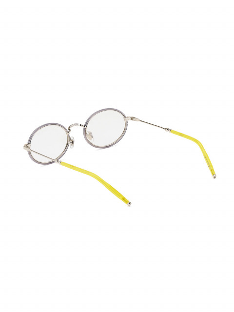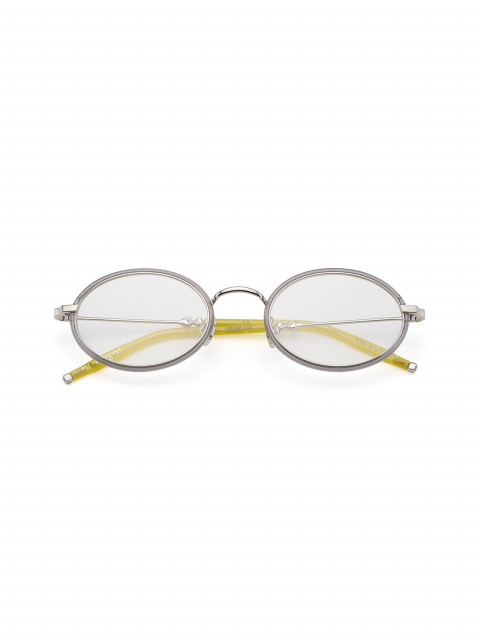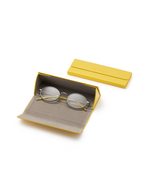 Коллаборация с петербургским брендом очков P.Y.E — очки овальной формы, вдохновленные британскими 90-ми. Серый ацетат и желтые заушники. (Официально наша любимая оправа!)