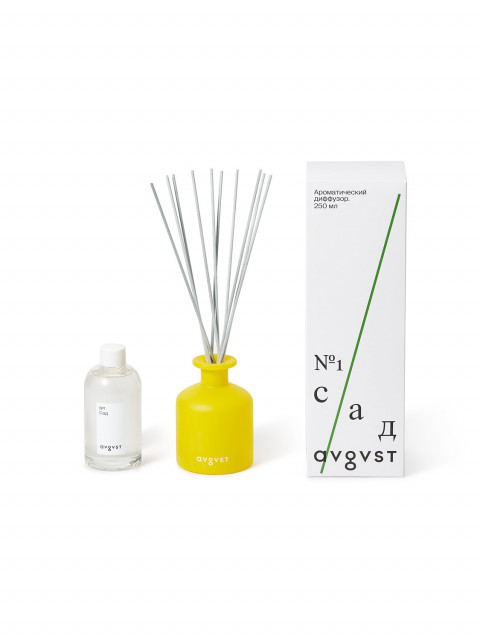 Аромат для дома №1 Сад — грозовой и зеленый. Прохладный бодрящий воздух, наполненный озоном. Черная смородина с куста, базилик, жасмин и влажная зелень. Диффузор с ротанговыми палочками и незаметным логотипом, чтобы в комнате пахло августом. Этот аромат разработан для Avgvst в Fakoshima Perfumes. Флакона хватит на 3-4 месяца, затем диффузор можно использовать вторично.