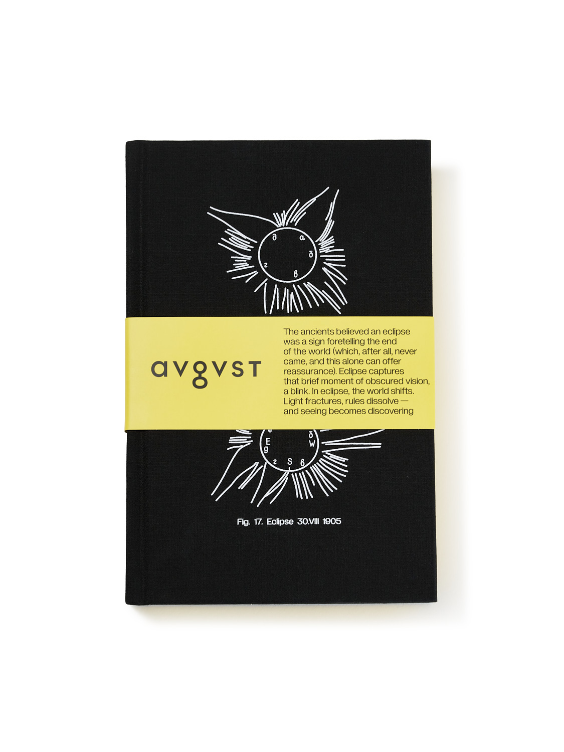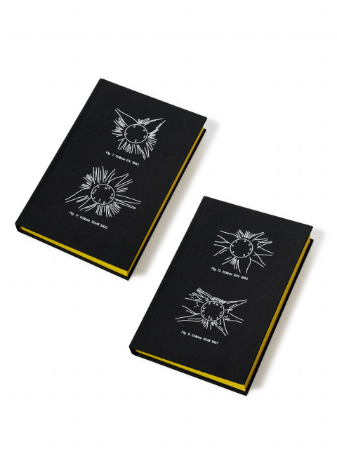 На обложку шелкографией нанесены схемы солнечного затмения, главного мотива коллекции Eclipse. Затмение — краткий миг, препятствие на пути светового луча, время суеверий. Но в конце концов солнце всегда возвращается.