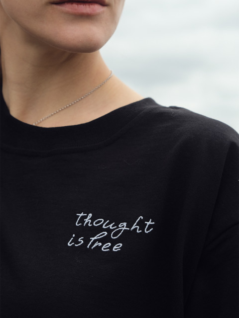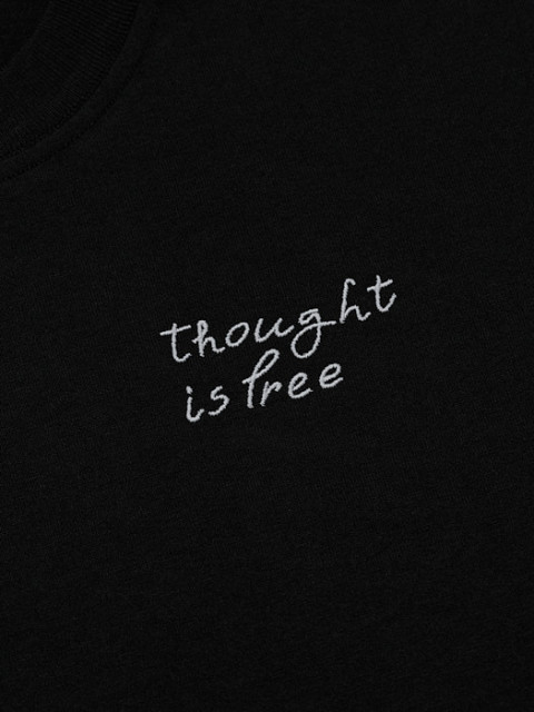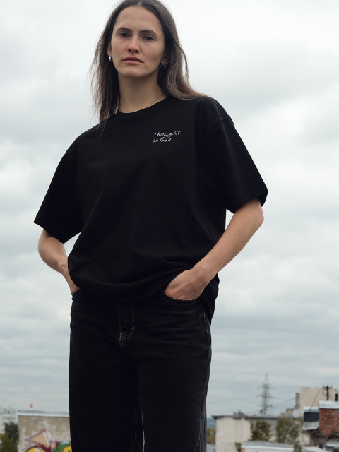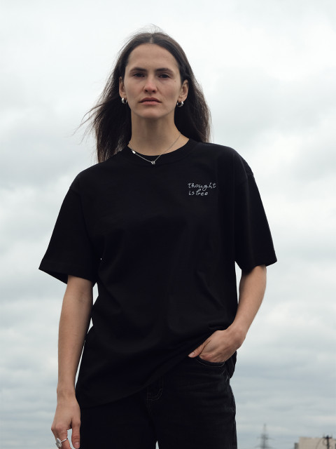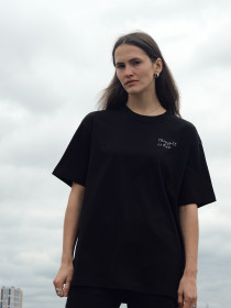 Та самая идеальная футболка из плотного рыхлого хлопка «как у японских брендов». На футболке вышит фрагмент стены Августа, нашего главного паттерна этого года. The Wall — это расписанная граффити стена, где зритель может разглядеть цитаты, рисунки и знаки.