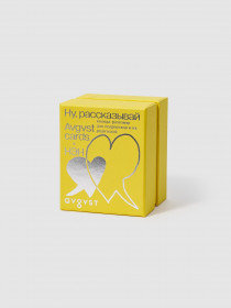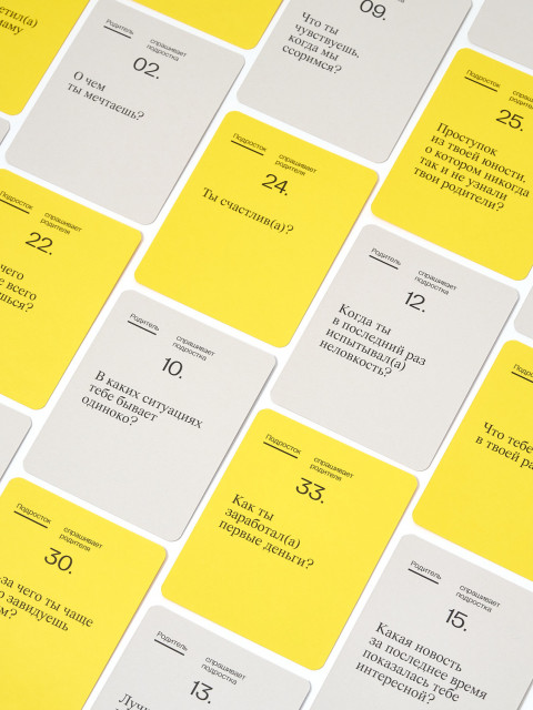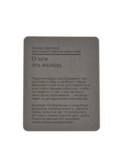 В колоде «Ну, рассказывай!» — 100 карточек с вопросами: 50 для взрослого и 50 для подростка. Эту игру мы сделали вместе с медиа для родителей «Нет, это нормально». Вопросы составила Ольга Уткина. Дизайн — Дмитрий Кавка.