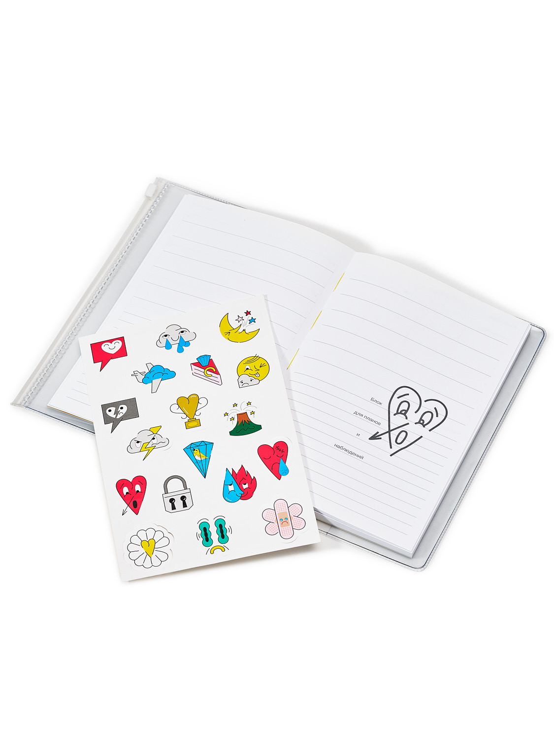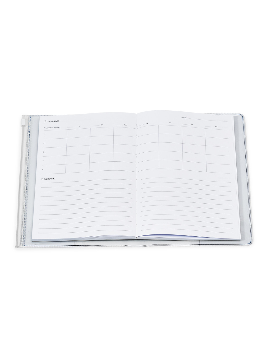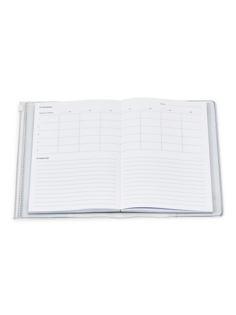 Планер обёрнут в прозрачную обложку с зиплоком и отделениями для мелочей.
