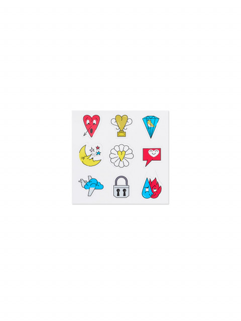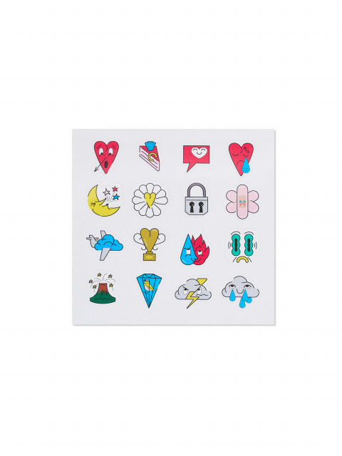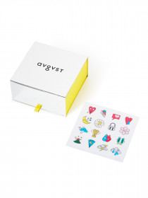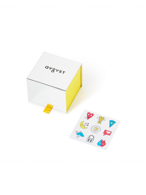 Коробка из зеркального серебряного винила с логотипом на крышке и набором цветных стикеров-пожеланий — украсьте коробку как нравится или приложите набор к подарку. Автор стикеров — художник Дмитрий Кавка.