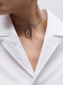 Мы предусмотрели разные варианты стилизации двойного звена: предлагаем носить на длинной цепи, обмотать дважды вокруг шеи или надеть на серьгу-хуп.