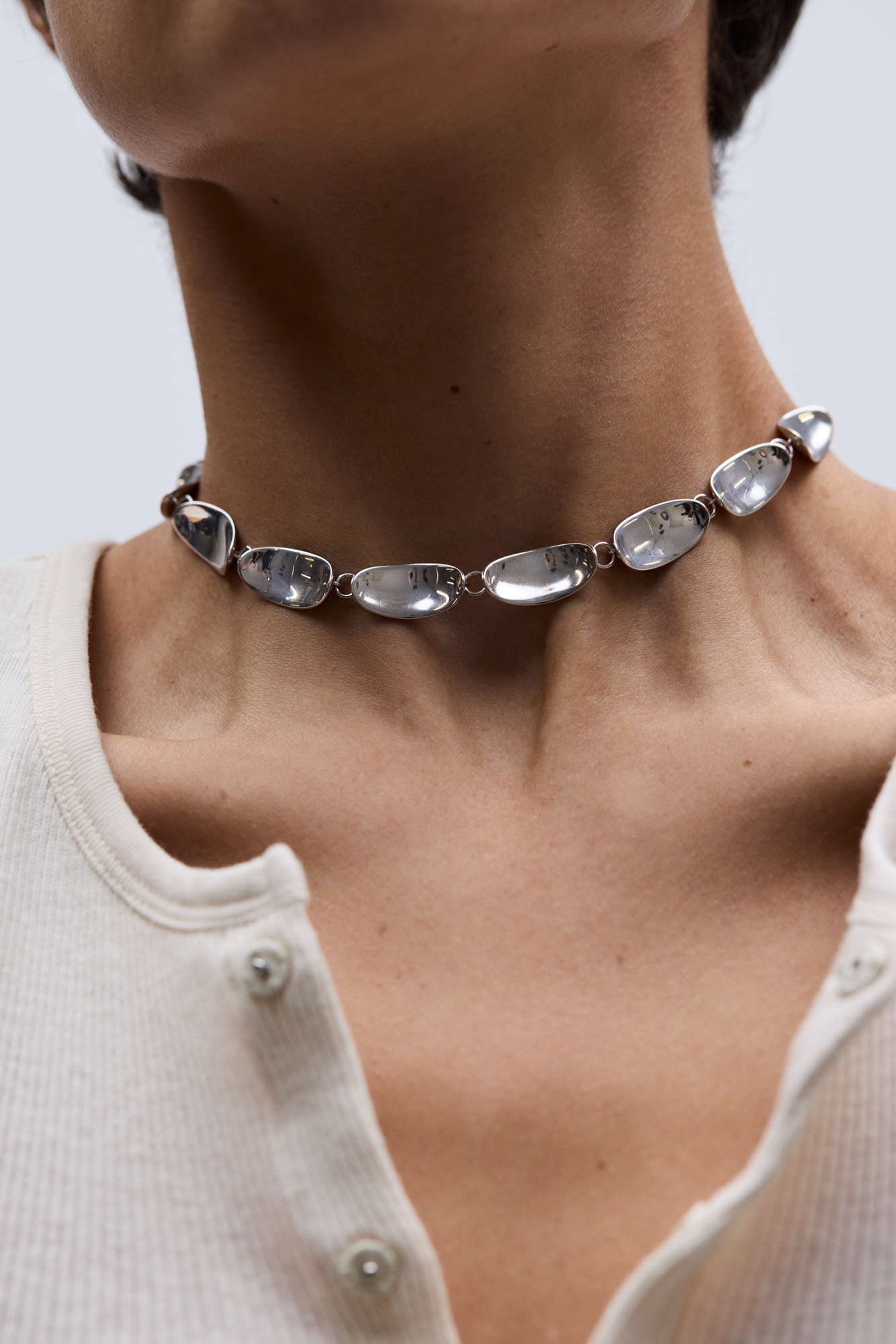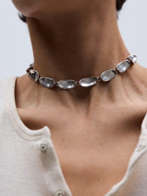 Легкое, но заметное украшение из вогнутых эллипсов, которые собирают и отражают падающие лучи света. Если поймать нужный угол (или делать селфи со вспышкой в некоторых ракурсах) то на коже появятся красивые рефлексы.