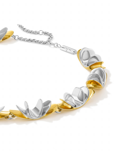 Короткое ожерелье-чокер собрано из эллипсов, немного напоминающих космические лепестки, примагниченные к шее. Сочетания двух цветов покрытия мы добиваемся вручную.