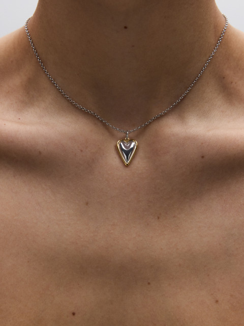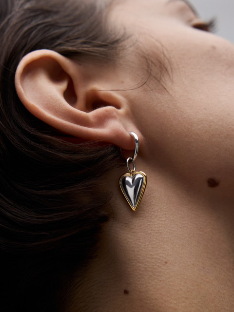Чтобы в одном украшении соединились два цвета металла, каждое собирается и покрывается родием и золотом вручную. Сердце можно снять с цепочки и носить на серьге-хупе.
