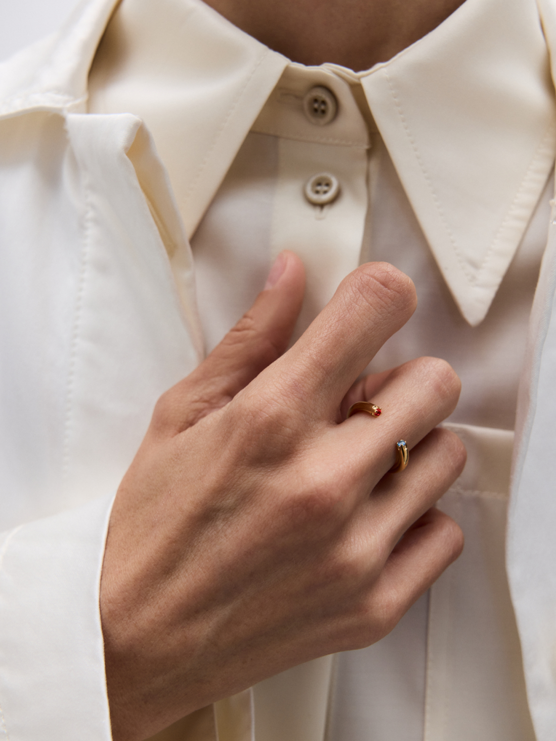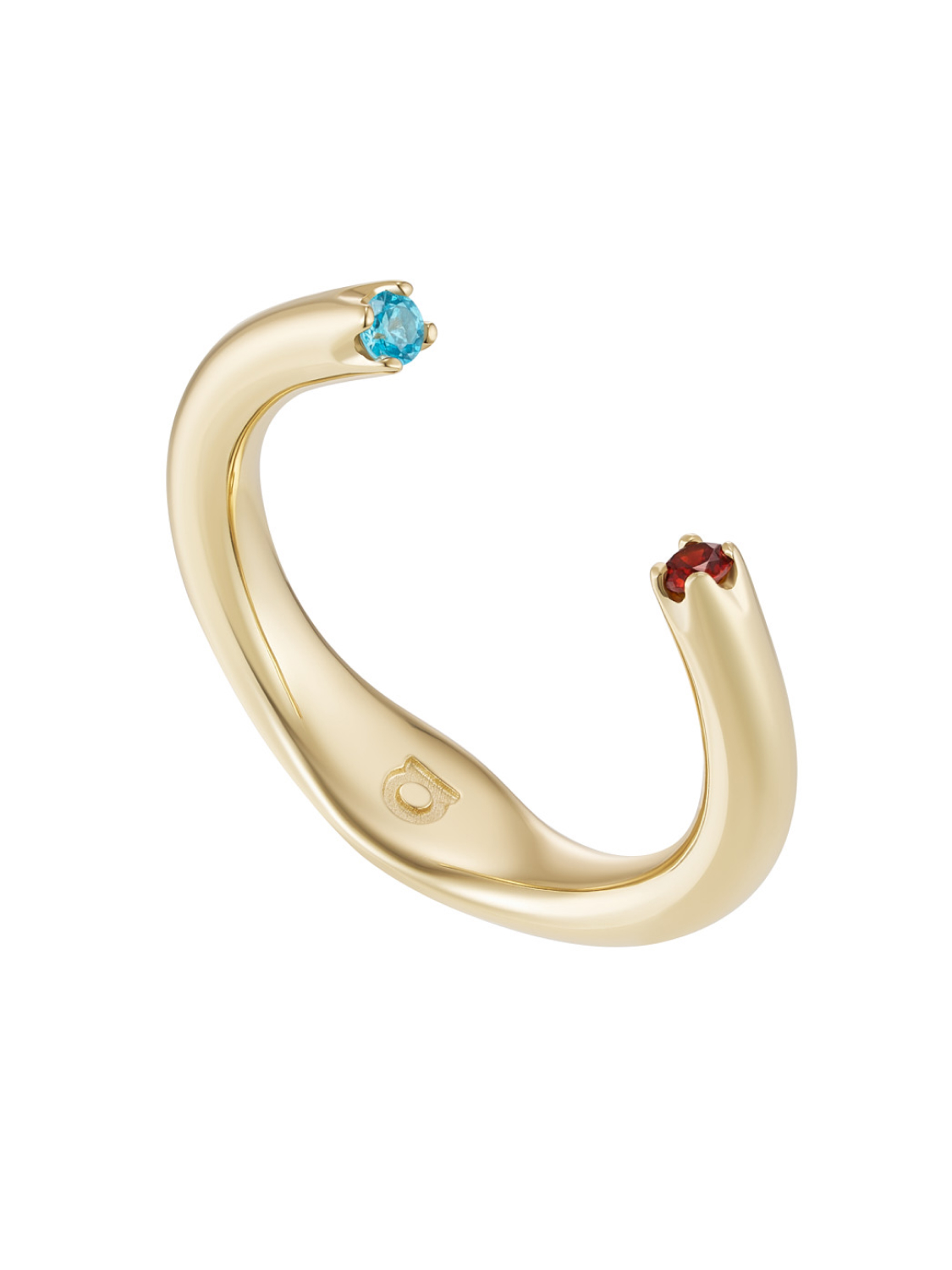 Это кольцо с голубым топазом и гранатом будто обнимает палец. Концы слегка приподняты для комфортной посадки, а форма крошечных лапок-крапанов отсылает к фирменным лепесткам J.Kim.