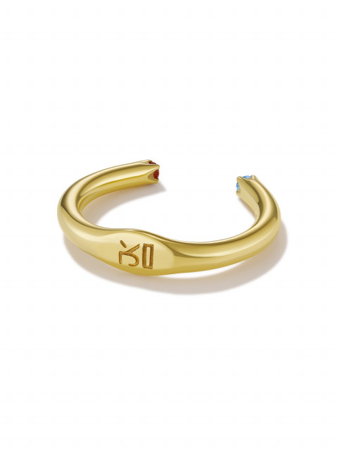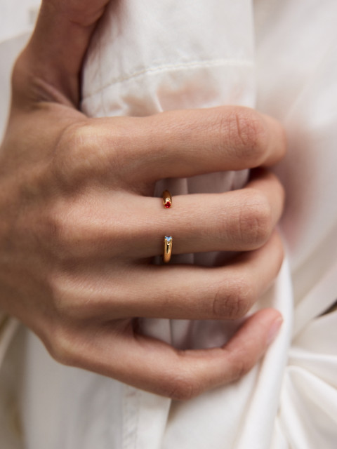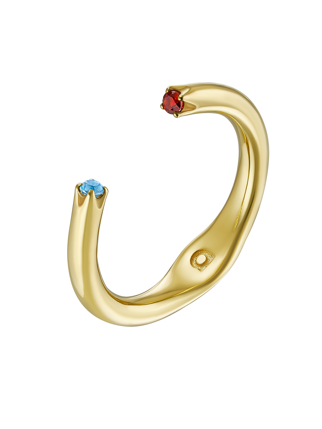 Украшение из коллаборации Avgvst x J.Kim. Это кольцо с голубым топазом и гранатом будто обнимает палец. Концы слегка приподняты для комфортной посадки, а форма крошечных лапок-крапанов отсылает к фирменным лепесткам J.Kim.