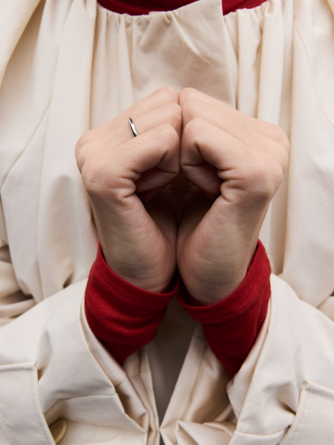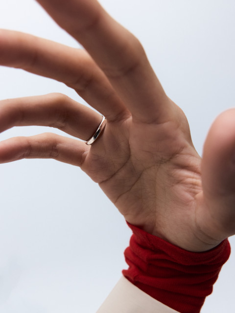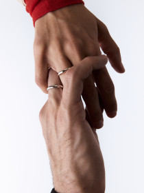 Кольцо плавных форм. Вдохновлено картиной «Помолвка» Лукаса Ван Лейдена, фламандского художника, на которой жених надевает «пухлое» кольцо невесте на (внезапно!) указательный палец. Любые традиции создаются людьми. Так почему бы не придумать свою?