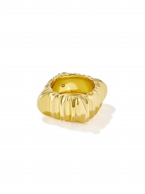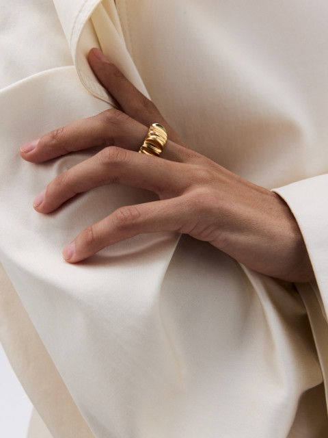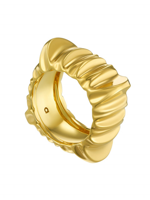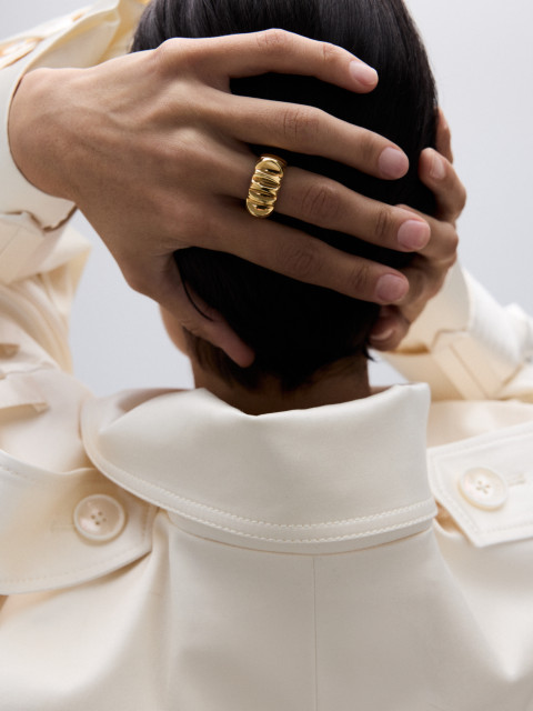 Широкое текстурное кольцо необычного силуэта, придуманное во время изучения фотографий солнечной «короны» — самого горячего слоя атмосферы Солнца. Удобное, заметное, а ещё будет хорошо оттенять гладкие объемные кольца, надетые рядом.