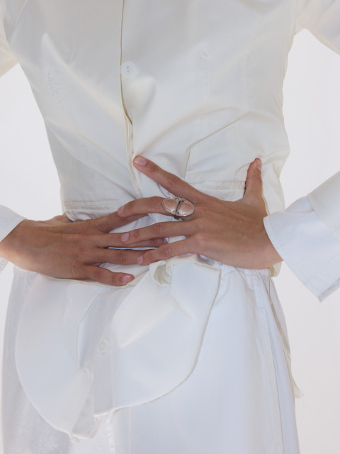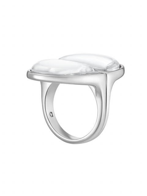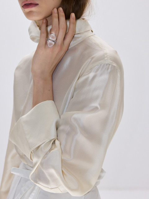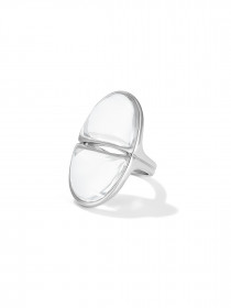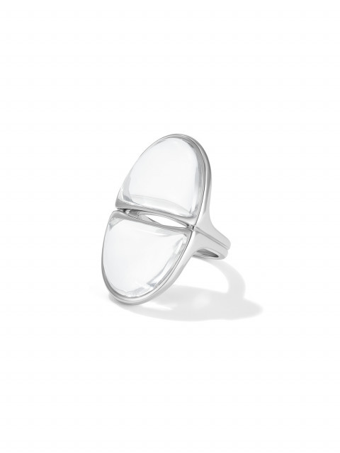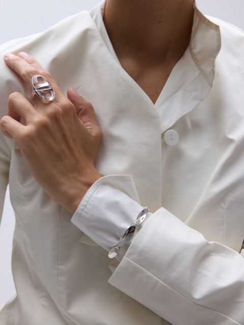 Самое заметное кольцо в коллекции в виде двух сложенных и отзеркаленных эллипсов. Между двух элементов находится маленькое узкое «окошко», через которое проглядывает кожа. Нам нравится, когда тело становится частью дизайна. Горный хрусталь для всех украшений Avgvst гранят вручную по нашим эскизам.
