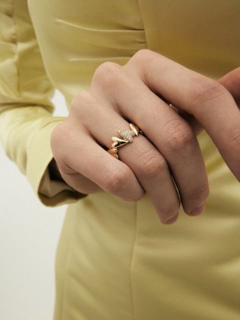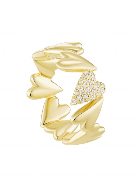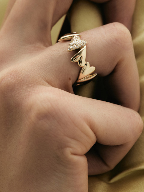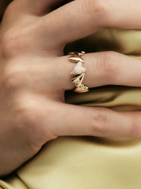 Кольцо-вертиго, кольцо-танец золотых сердец, одно из них покрыто бриллиантовым паве.