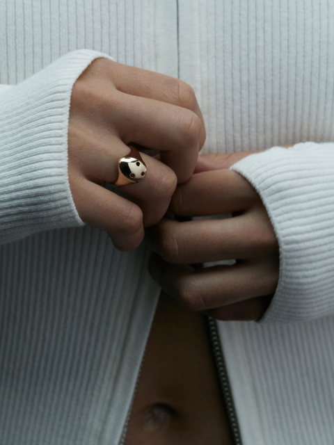 Массивное, но совсем не тяжелое золотое кольцо, которое подойдет на каждый день. У этой маски три глаза, а третий внимательно смотрит внутрь.