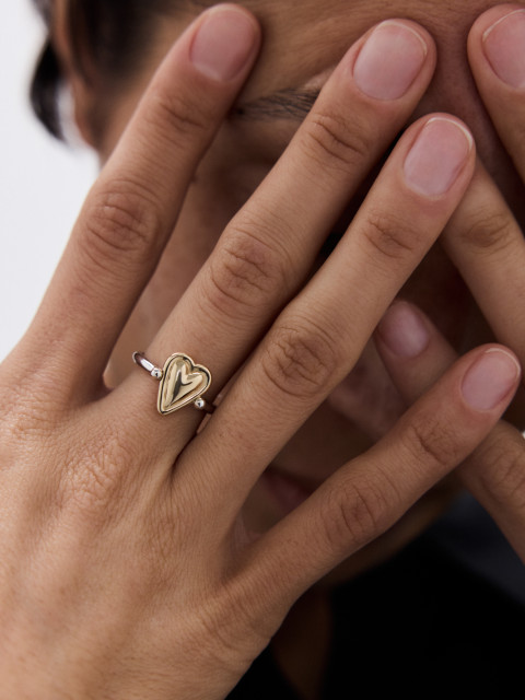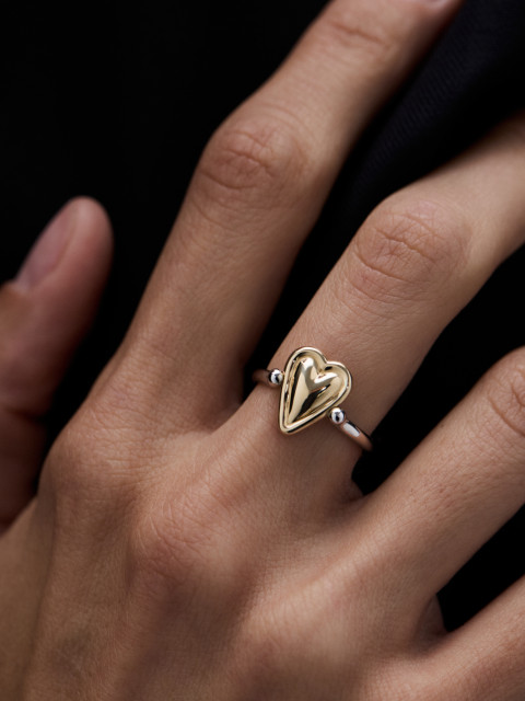 Чтобы в одном украшении соединились два цвета металла, оно собирается вручную из нескольких деталей. В этом украшении шинка (основа кольца) из белого золота, бампер из лимонного золота, а у сердца одна сторона белая, другая лимонная.