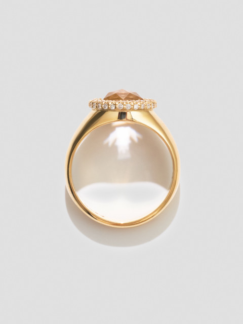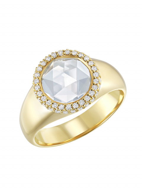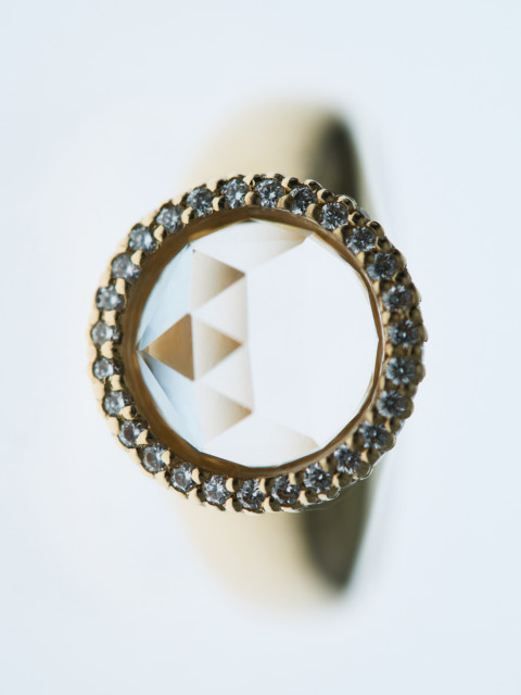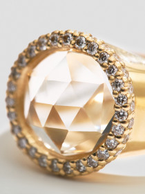 О любви, но не буквально. Кольцо из золота с хрусталем ручной огранки задумано под впечатлением от крупных модернистских украшений. Форма камня отсылает к старинной огранке бриллиантов, которая и называется «роза». Вокруг розы хоровод бриллиантов, а на внутренней стороне кольца спрятан секрет: пара отпечатков сердец.