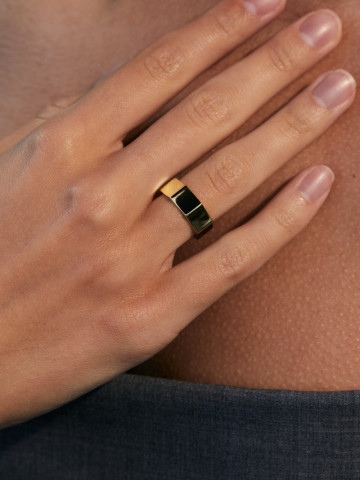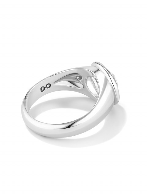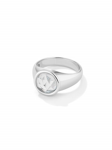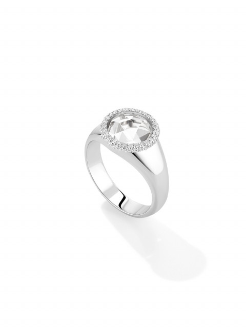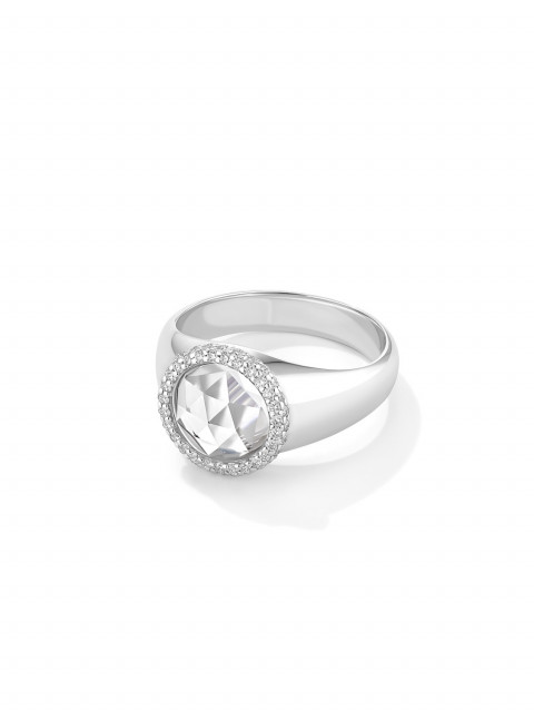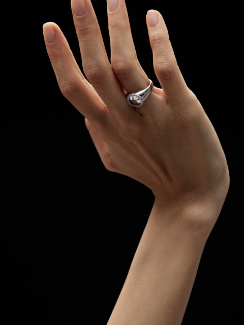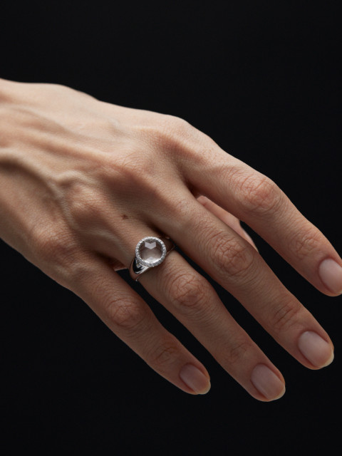О любви, но не буквально. Кольцо из золота с хрусталем ручной огранки задумано под впечатлением от крупных модернистских украшений. Форма камня отсылает к старинной огранке бриллиантов, которая и называется «роза». Вокруг розы хоровод бриллиантов, а на внутренней стороне кольца спрятан секрет: пара отпечатков сердец.