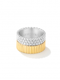 Стеклярус — и символ хрупкости, и строительный материал, из которого мы выстраиваем украшения, как небольшие бруталистские здания. Нам нравится стилизовать это кольцо с гладкими полированными кольцами.