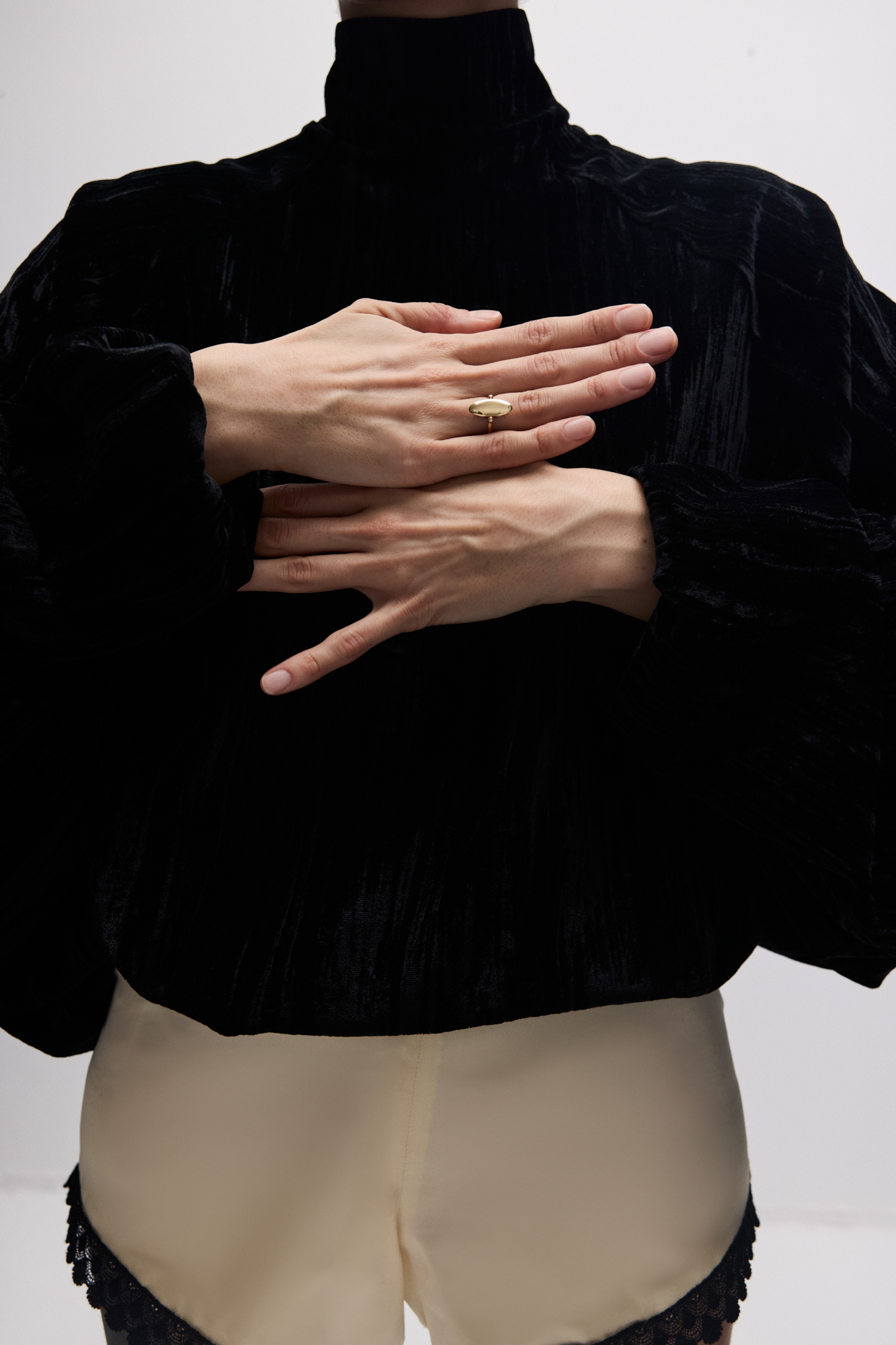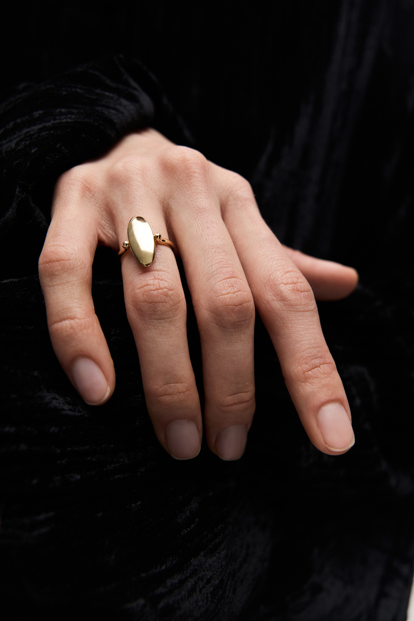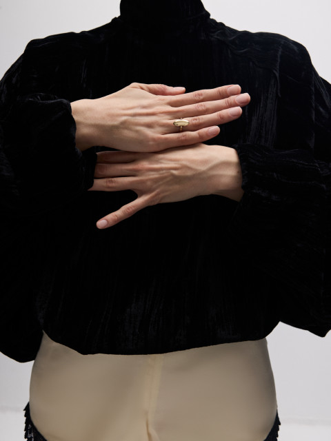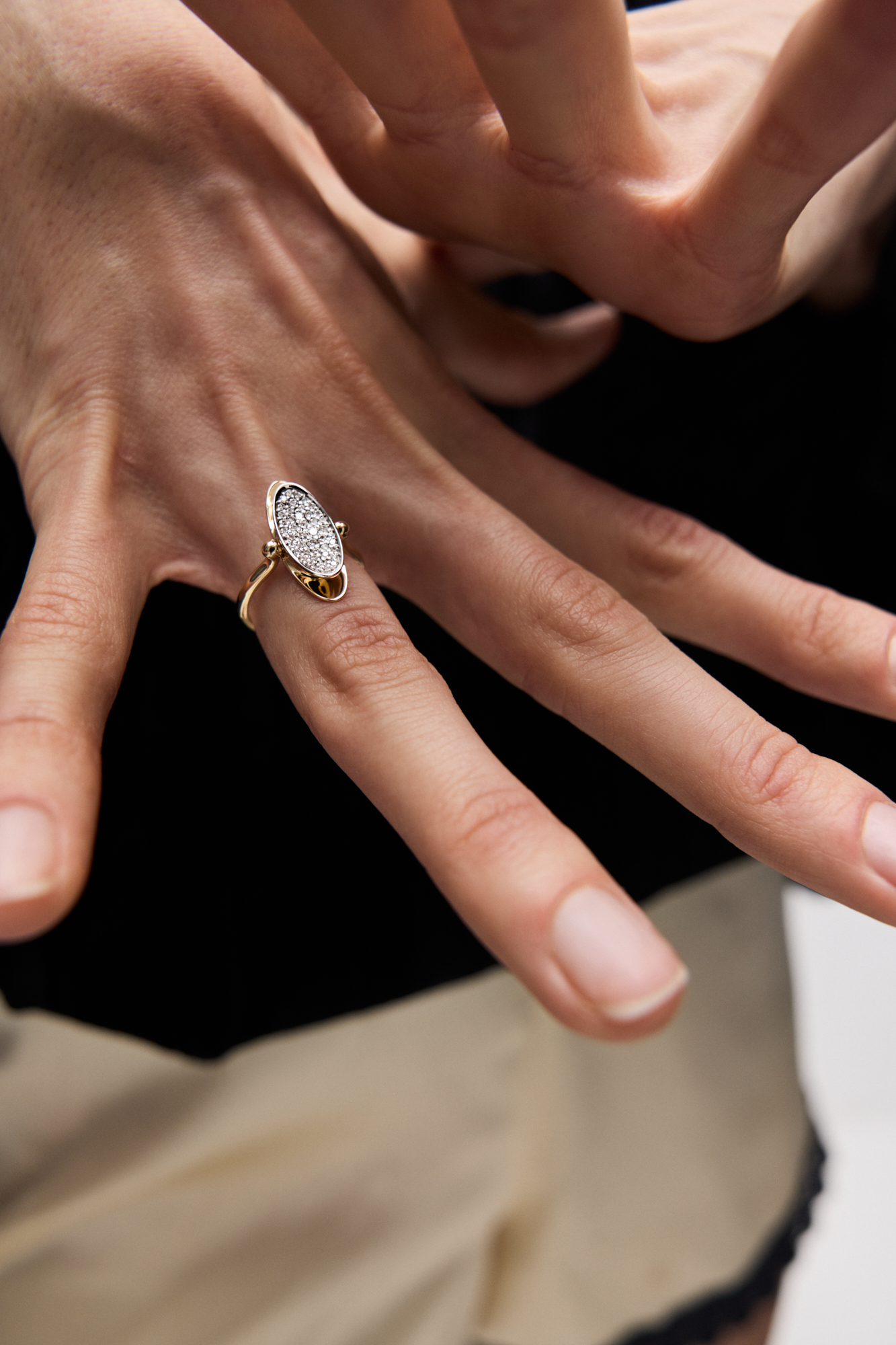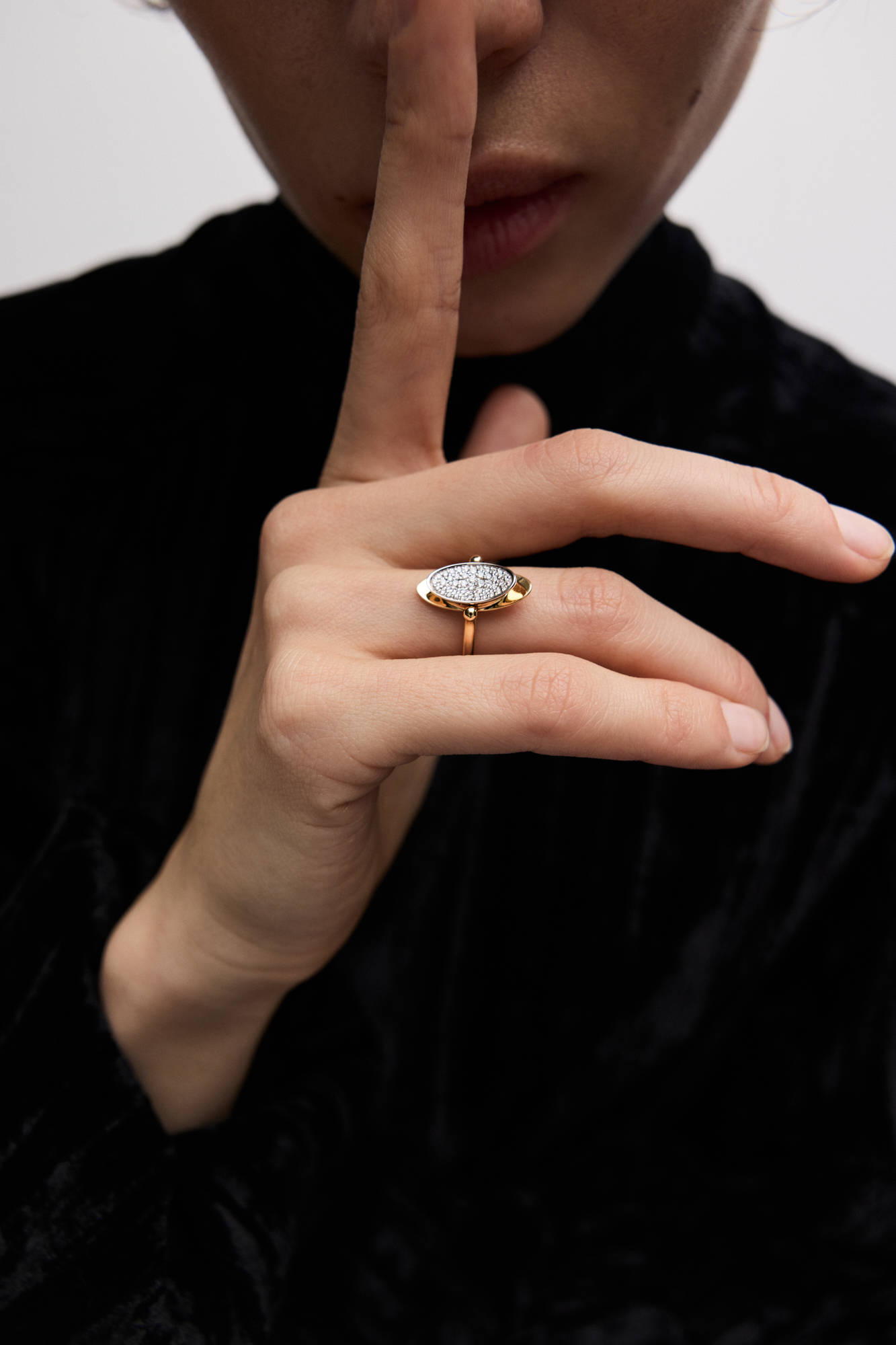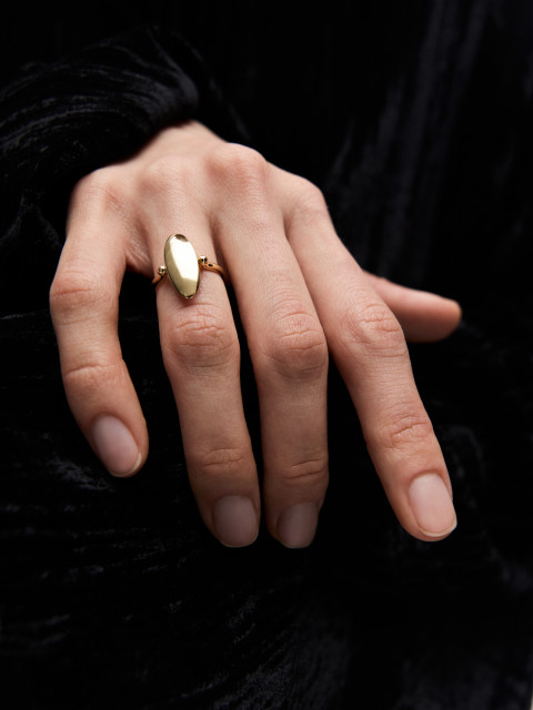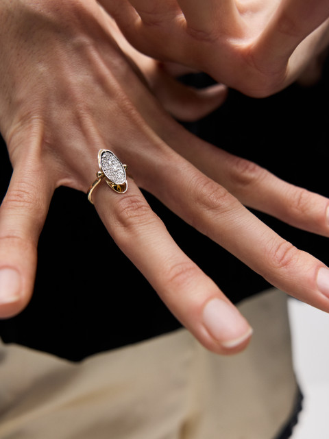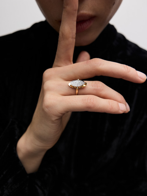 Кольцо-перевертыш из двух эллипсов, будто притягивающихся друг к другу. Вогнутая поверхность покрыта россыпью бриллиантов, а обратная сторона гладко отполирована: стороны по-разному отражают свет.