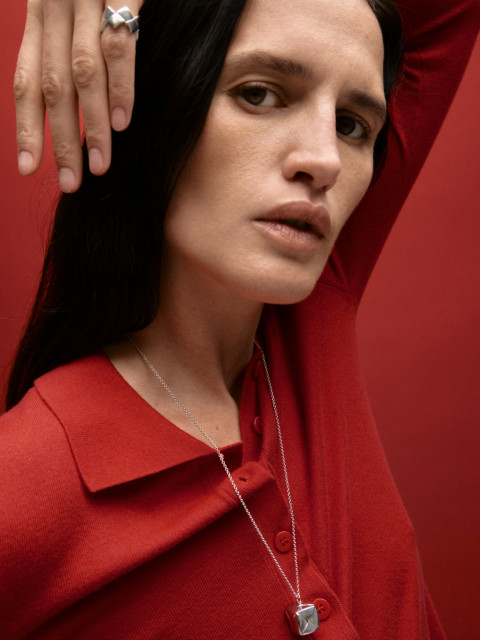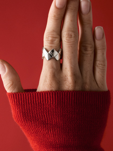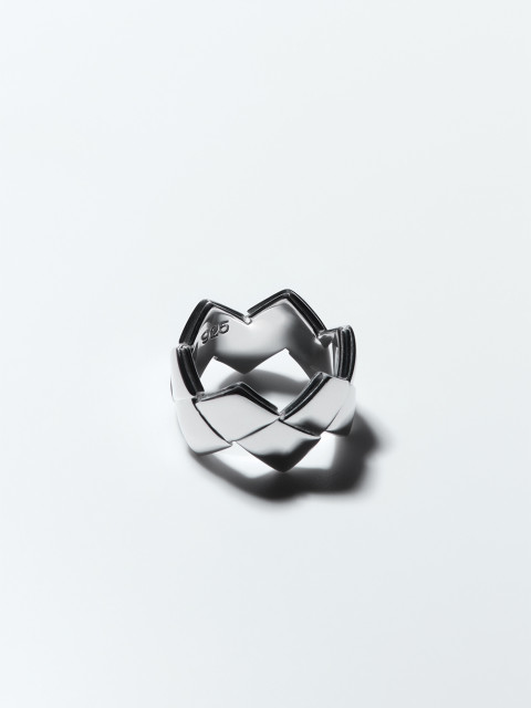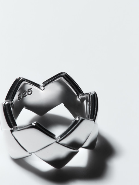 Форма кольца из отполированного серебра повторяет край плетения берестяной утвари. Как и все широкие кольца, это будет комфортнее, если взять на полразмера больше.