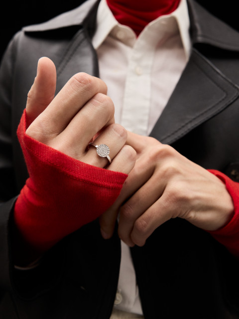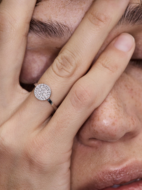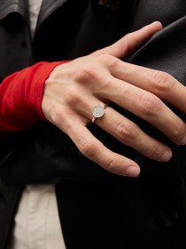 Лаконичное и элегантное кольцо из белого золота, которое подходит к обручальному кольцу с бриллиантами в грани.
